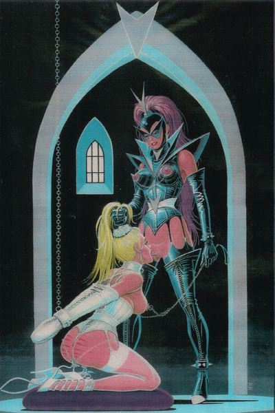 The luscious and spaced-out blonde hangs there working her jaws and breathing hard through her mouth in the doorway to her own girlish bedroom, once her private sanctuary, now redecorated with all the bizarre accoutrements of bondage and discipline. Her eyes wander to the long row of whips, straps and paddles hanging over her bed, dominating the room with their evil sense of purpose. Noticing this, Fiona taunts her… "Can't wait for your first real whipping, can you, hot pants? You know you're gonna get it tonight. Just wait until I tell the boss how you came with that slime-ball Spider's twisted pecker up your butt. He'll punish you good…" Fiona takes up her silver tray and leaves the room, doubtless to make herself another fix, leaving Alison alone with her thoughts.
