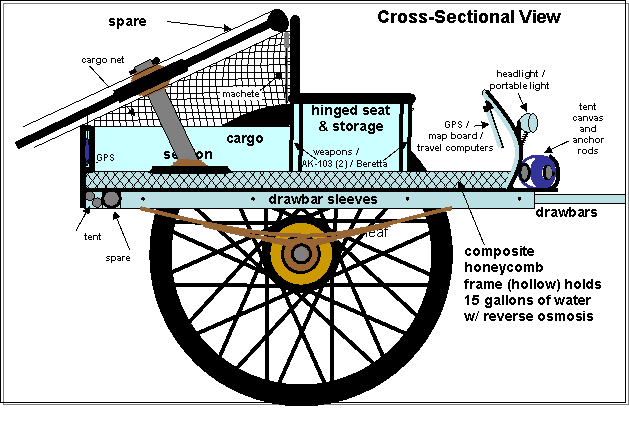 Joseph came up behind her and wrapped an arm possessively around Joan. “The cart is unique; none like it has ever been built. The entire assembly is constructed of high-tech man-made materials. Even though it is nearly indestructible, the weak link remains the wheel, that's why we have a spare. The extra-large diameter wheels let it roll easily over most obstacles and the leaf springs keep the ride smooth. The three drawbars unpin from their sleeves, slide forward, and pivot down to make the ridges of a low profile tent. Storage wells hold side poles, canvas, and a spare axel. In the desert, it'll only take two to three minutes to set up the tent, providing shelter from the sun and rest during the hottest part of the day. There is lots of storage; under the seat, in the storage bed behind the seat, and the honeycomb matrix of the body holds fifteen gallons of water. A built-in reverse osmosis filter well cleans any water that can be poured into the honeycomb. The wheel rubber is incredibly strong, solid, and without air pressure so it can't become flat.