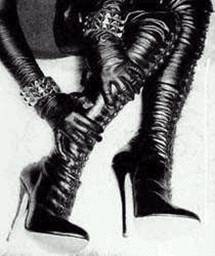 were black leather, thigh high lace up's, with 6” needle thin metal heels and