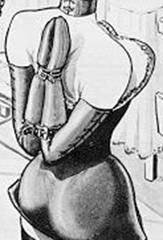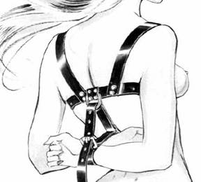 Per, zipped the front back up and covered the zip with the velcro flap . H e then went behind and tightened the top lacing so that Dor ' s waist was smoothly defined and her breasts jutted out from a flat bodice. Next he pulled both her arms back and fastened them together at the elbow and the wrist using the webbing straps. He tightened them until Dor ' s elbows were touching and her shoulders were pulled well back. This had the added effect that her breasts were pushed even further out.