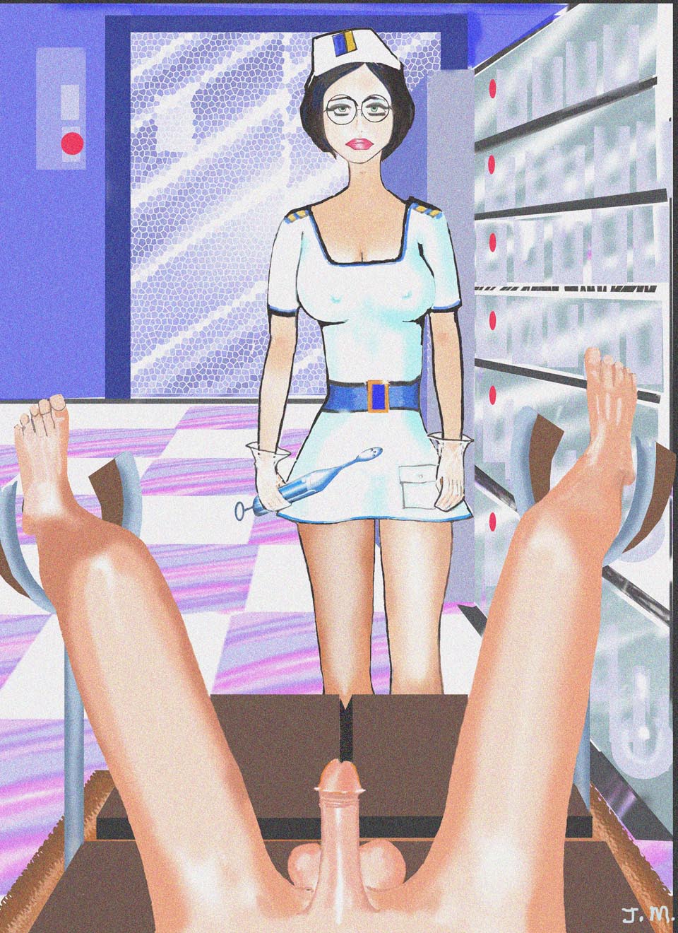 As Jane further examined the nurses she noticed that they were both beautifully made up and looked quite studious in their wire framed glasses. Their jet back hair was cut very short and Jane thought that perhaps they could be sisters. She also noticed that their short white tunic dresses were exquisitely cut and that the material was of a particularly fine and expensive cotton. As the younger of the two nurses turned towards the boy, Jane could see a faint colouring of flesh beneath her dress, intimating to her that perhaps both of the girls were naked beneath their sheer garments. Judith addressed her girls, ignoring the frightened look of the naked young boy.